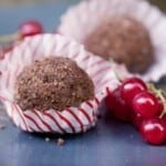 Grind the remaining sweet cacao nibs in a spice grinder to form a coarse powder, and place into a small bowl. Use a melon ball scooper to form the truffle mixture into a ball, then carefully roll the ball in the cacao nib powder to dust the outer surface. Place on a plate, and repeat to form remaining truffles. Refrigerate the truffles for one hour longer to set completely, then store at room temperature.